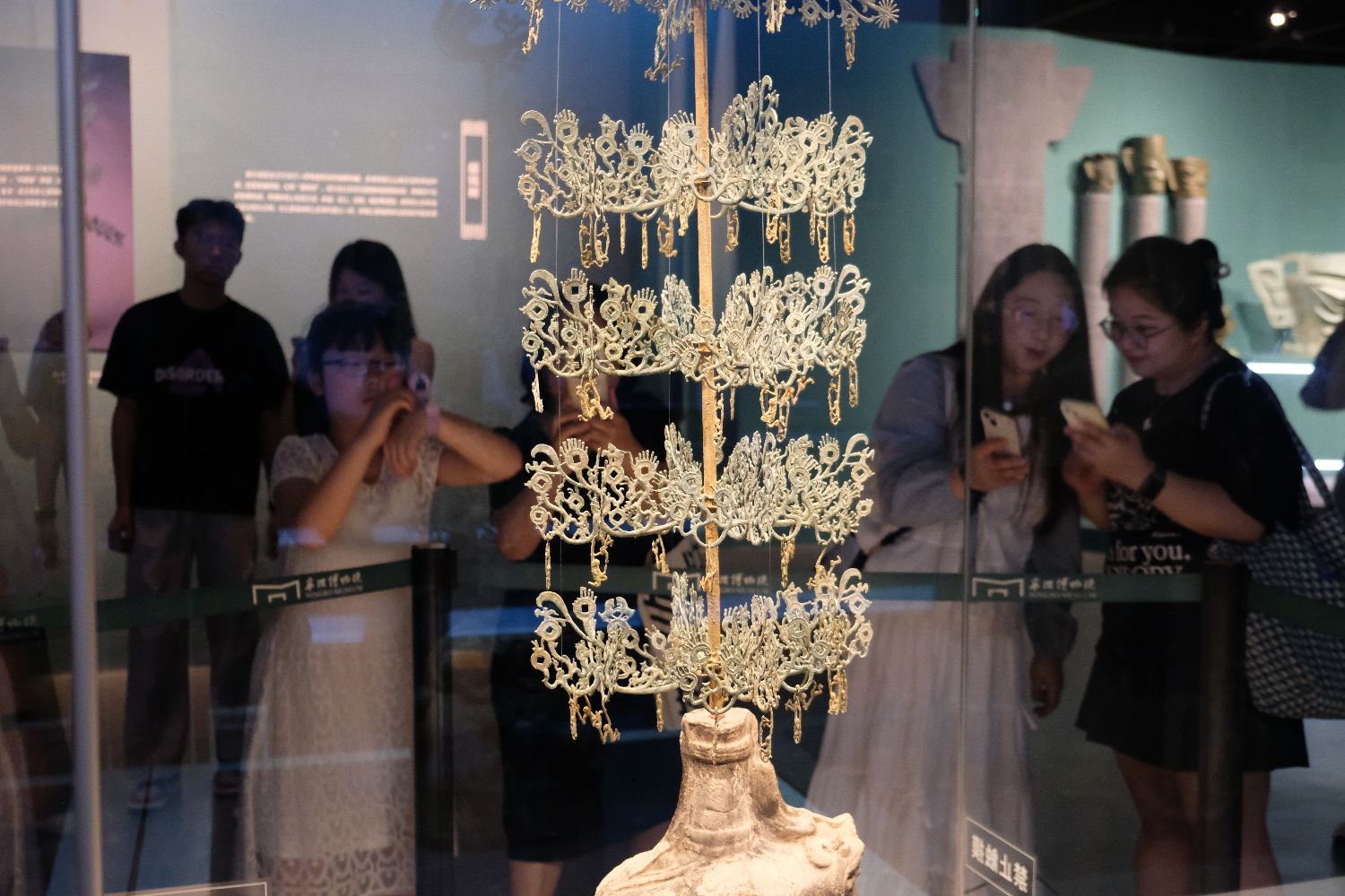 8月2日,游客在浙江宁波观看三台县博物馆藏“马猴摇钱树树身”。(图片来源:中新社)