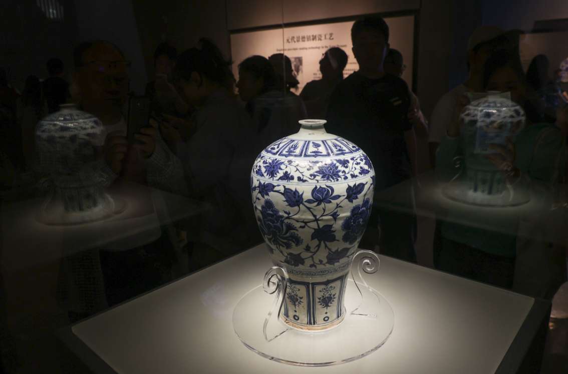5月10日,江西景德镇,景德镇中国陶瓷博物馆“镇馆之宝”之一的元代青花缠枝牡丹纹梅瓶吸引众多游人参观。(图片来源:中新社)