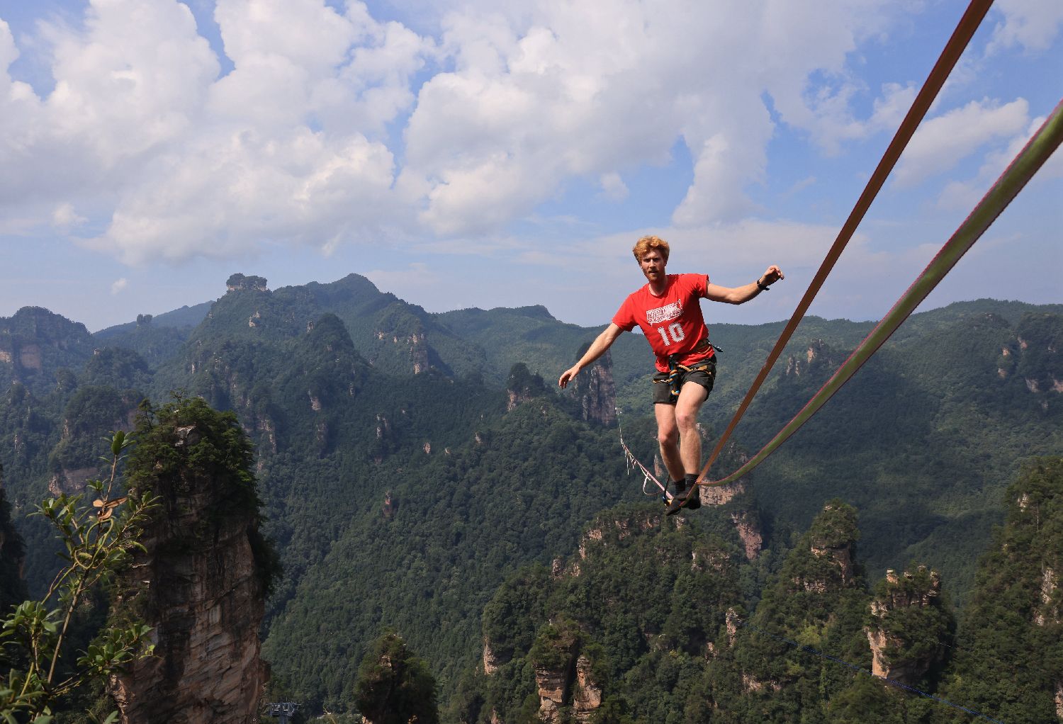 10国选手湖南张家界挑战千米高空扁带行走