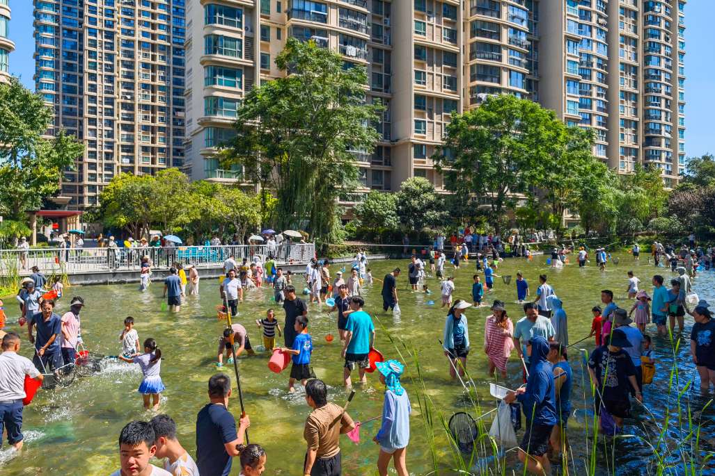 图为民众和孩子带着捞网、水桶等装备进入人工湖内捕捞鱼。(图片来源:中新社)