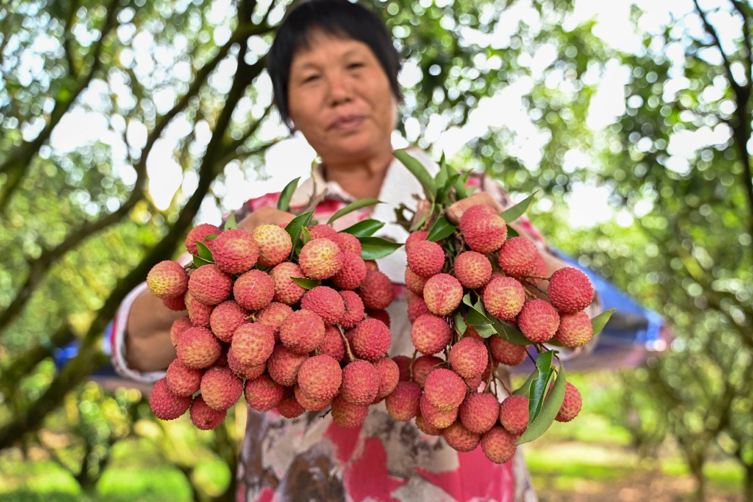 6月19日,广东茂名根子镇果农展示采摘的荔枝(图片来源:中新社)