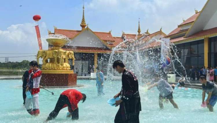 泼水狂欢派对将活动推向高潮。在音乐的节奏中,各族村民与游客拿起水盆涌入泼水区,进行泼水“大战”,瞬时水花在空中划出弧线。身穿傣族服饰的游客吴斓笑着说,洋林村新建的泼水广场,非常具有傣族风情。“在傣族,泼水代表传递祝福,希望把吉祥带给每个人。”