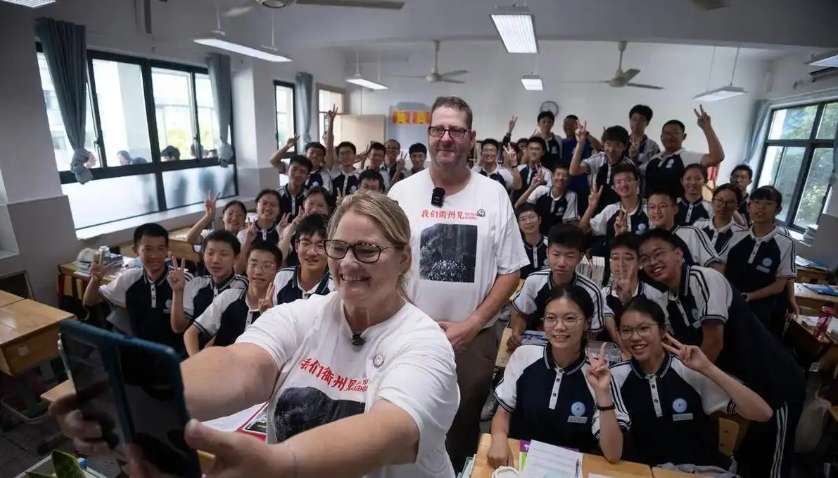 康特伯格夫妇和衢州二中的学生们合影。(图片来源:杭州“潮新闻”微信公众号)