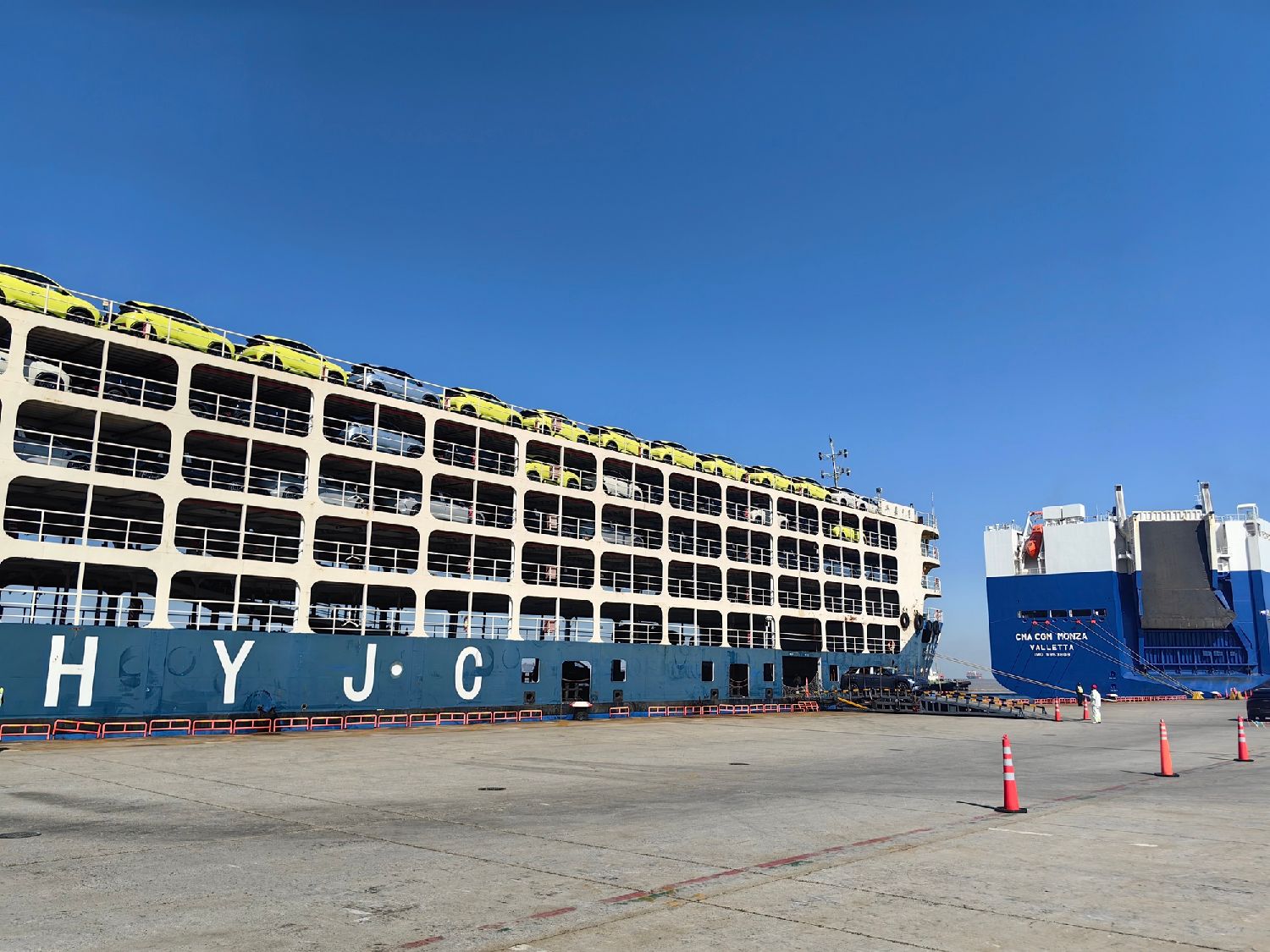 采用“江海联运”方式出口的中国国产汽车先“乘坐”长江驳船顺流而下,到达上海的码头后再“换乘”外贸滚装船远赴海外。在中国最大的单一整车滚装码头——上海外高桥港区海通码头,可以看到一派忙碌的运输场景:一艘从长江上游驶来的滚装汽车运输船(PCTC)停靠在泊位上,一辆辆汽车从中有序驶出,等待搭乘远洋滚装汽车运输船出海。就在一旁,一艘搭载进口汽车的滚装汽车运输船正在等待卸货。