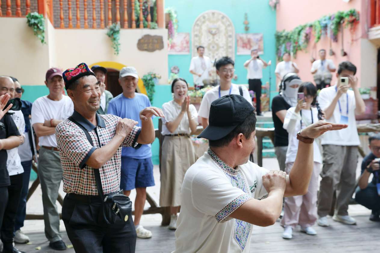 9月10日,新疆吐鲁番坎儿井民俗园景区,游客与表演者共舞。坎儿井是中国古代三大水利工程之一,坎儿井民俗园景区以展示坎儿井水利文化与维吾尔族民俗风情为核心,为游客带来多维度的深度旅游体验,是吐鲁番首家沉浸式主题体验园区。(图片来源:中新社)