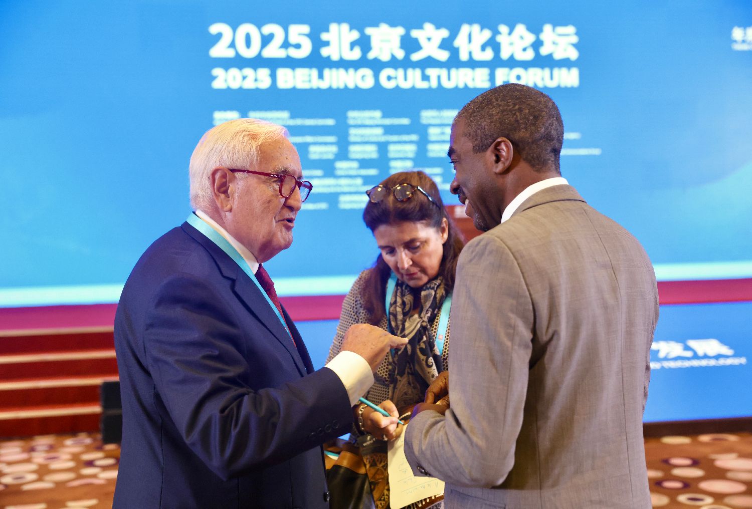 9月23日,2025北京文化论坛在北京开幕。图为法国前总理拉法兰(左一)和联合国教科文组织世界遗产中心主任拉扎赫·伊伦都·阿索莫(右一)在会前交谈。(图片来源:中新社)