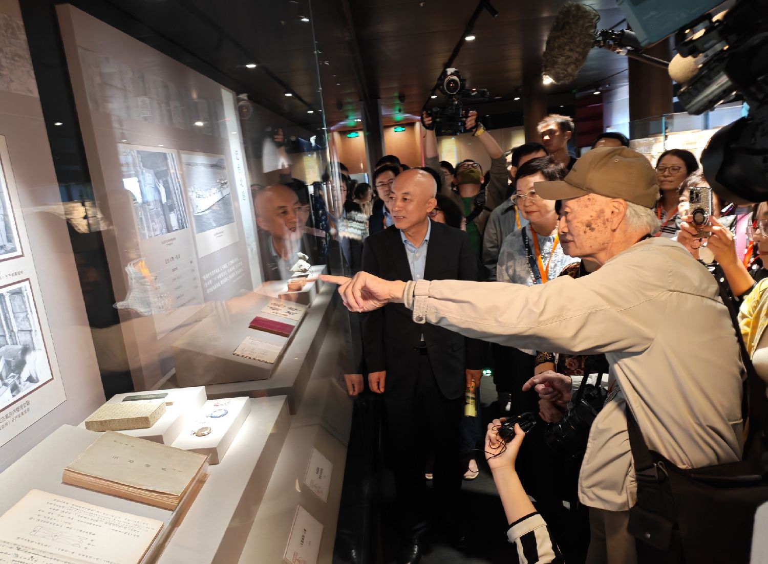9月30日,“故宫文物南迁纪念展”在故宫博物院开幕。图为台北故宫博物院原副院长庄严之子庄灵给北京故宫博物院院长王旭东讲述陈列展品。(图片来源:中新社)