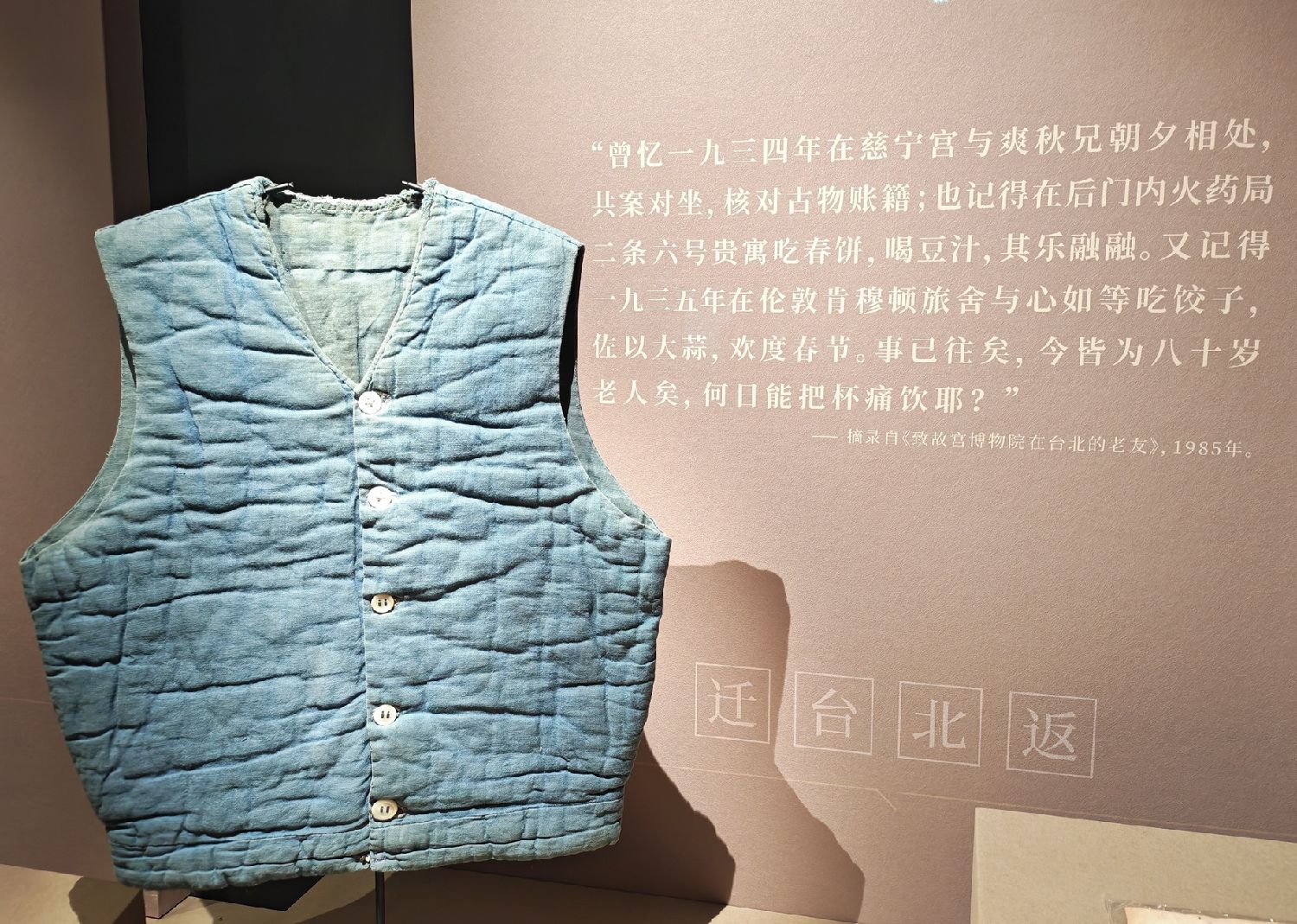 索予明是最后一位离世的故宫文物赴台押运人。当年,他告别故土,身上仅带着一件母亲缝制的蓝背心和两枚钱币,一句“回来再接你回南京”的承诺成为母子间的永别。如今,这件1949年的蓝背心出现在神武门展厅,也是故宫文物南迁出发的起点,无疑是对老人在天之灵的最好告慰。