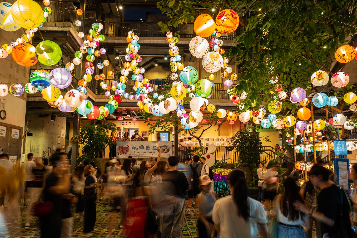 10月4日,位于香港湾仔的香港一级历史建筑“蓝屋”点亮主题为“悦夜月蓝”的彩灯艺术装置,逾700个由香港艺术家和湾仔街坊手绘的花灯为即将到来的中秋节增添喜庆氛围,吸引众多市民和游客前去拍照“打卡”。(图片来源:中新社)