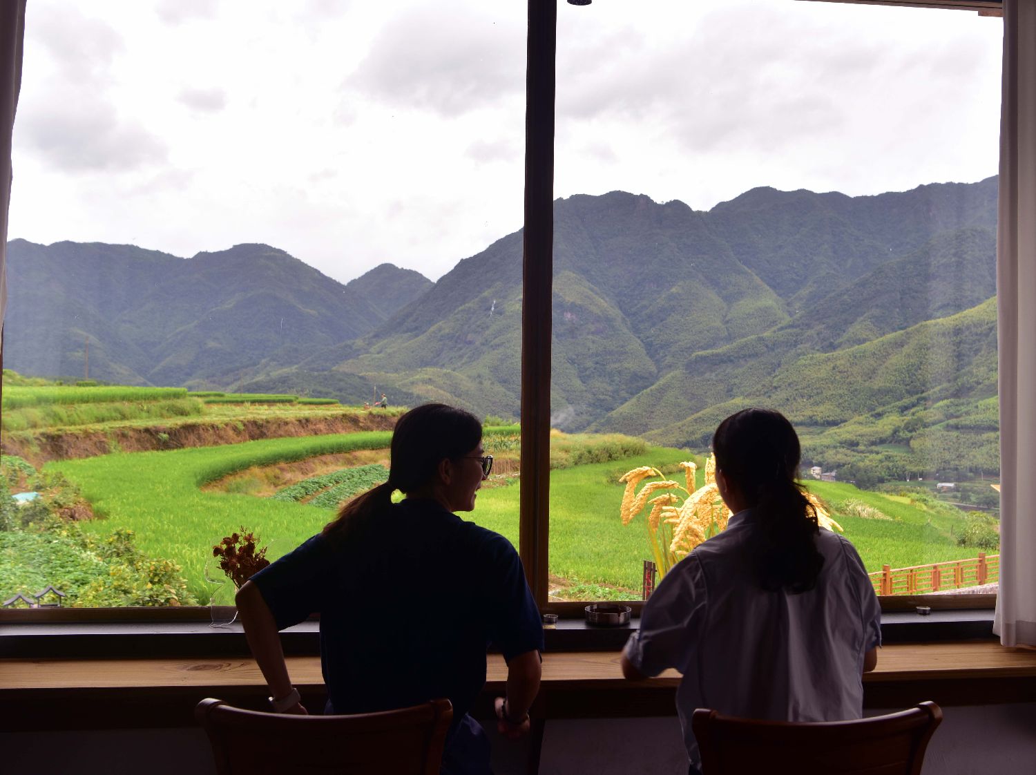 9月24日,游客坐在闽北念山梯田村咖边喝咖啡边看梯田美景。(图片来源:中新社)