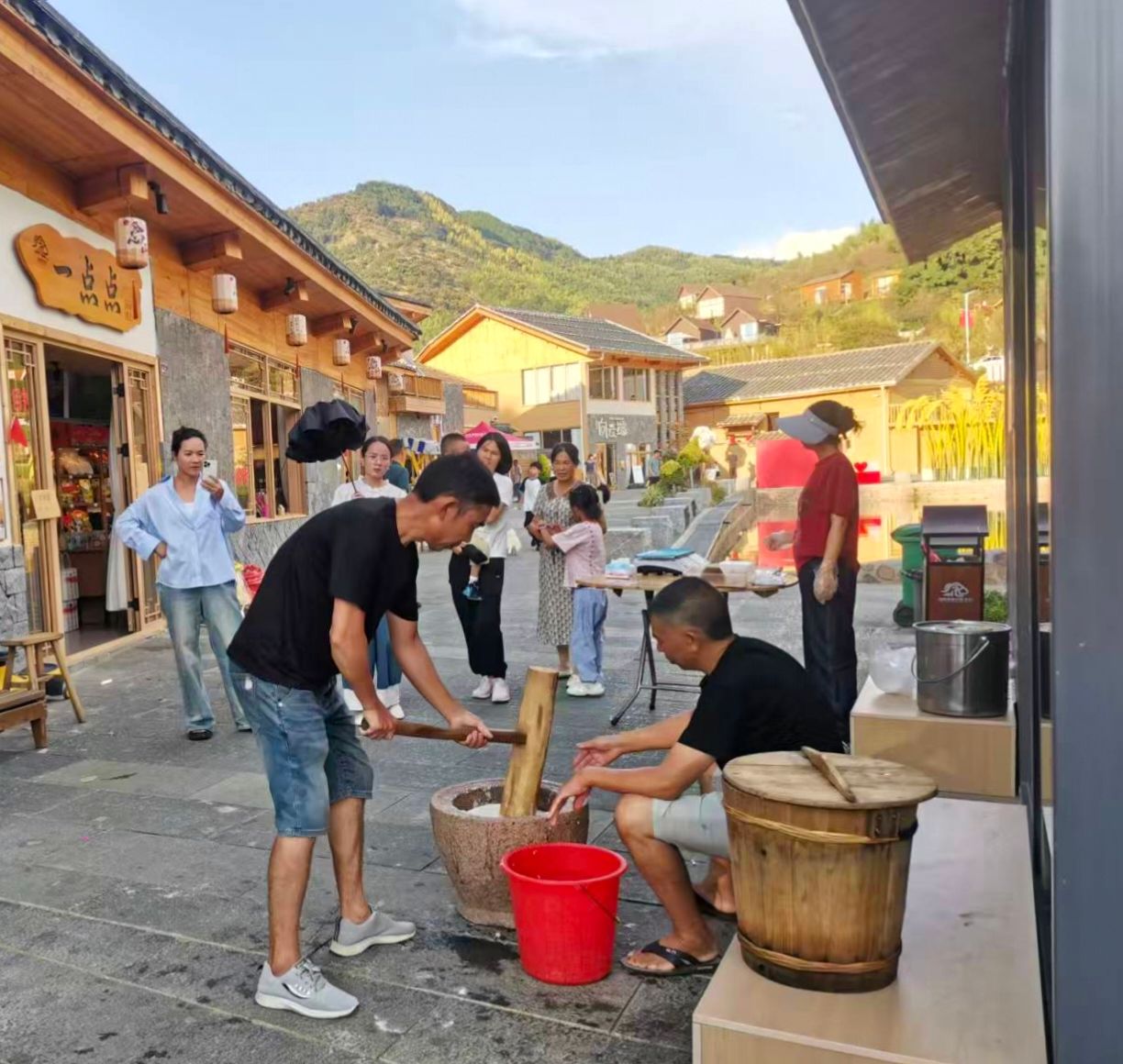 10月5日,游客在念山村体验打糍粑。(图片来源:中新社/星溪乡政府供图)