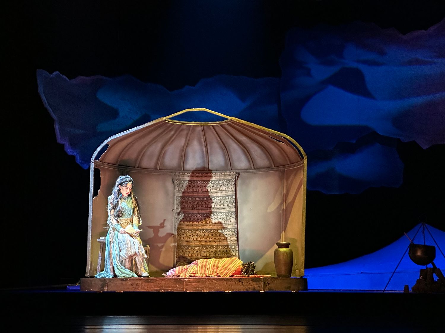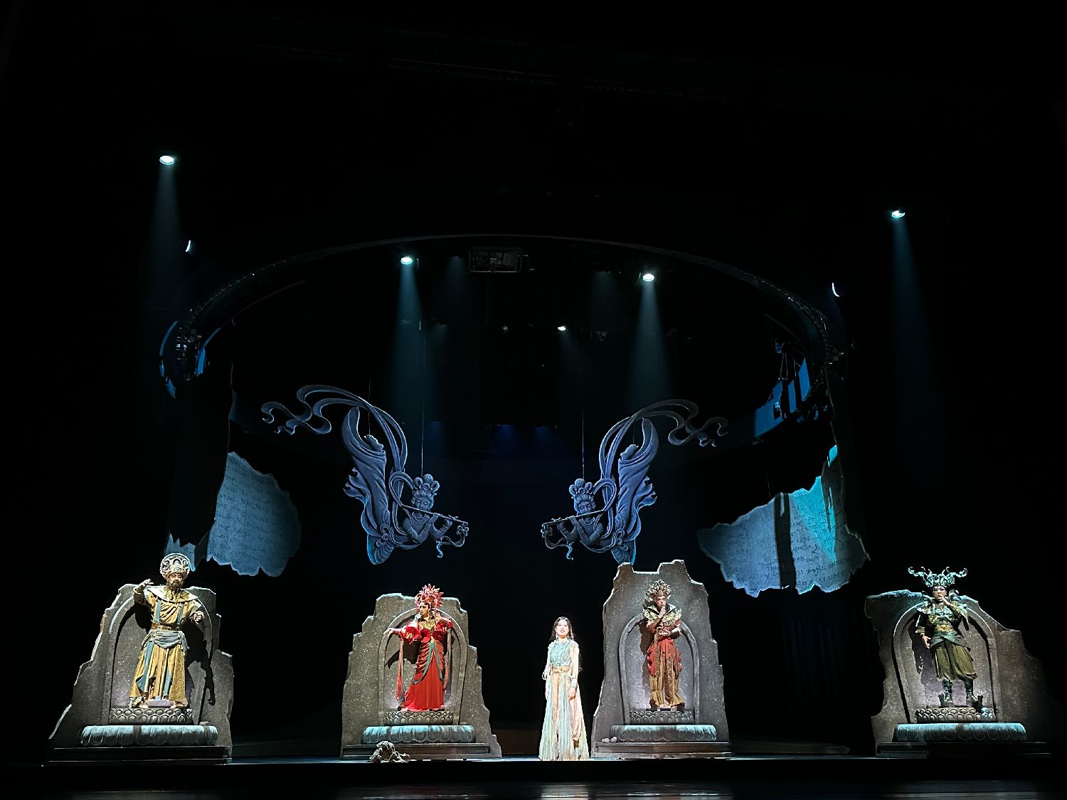 当晚,该音乐剧用多媒体技术还原沙暴、市集、洞窟的奇幻场景;旋转舞台的裸眼3D效果与纱幕投影交织,将科技与传统美学完美融合;服装造型结合了魏晋风格与多民族元素;故事内容上增添神话色彩与喜剧元素。