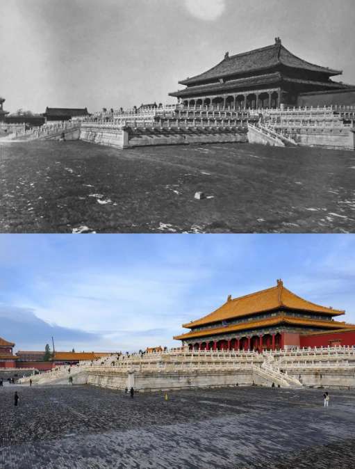 上图为20世纪初拍摄的太和殿(图片来源:北京故宫博物院供图)。下图为2025年10月10日拍摄的太和殿。(图片来源:新华社)
