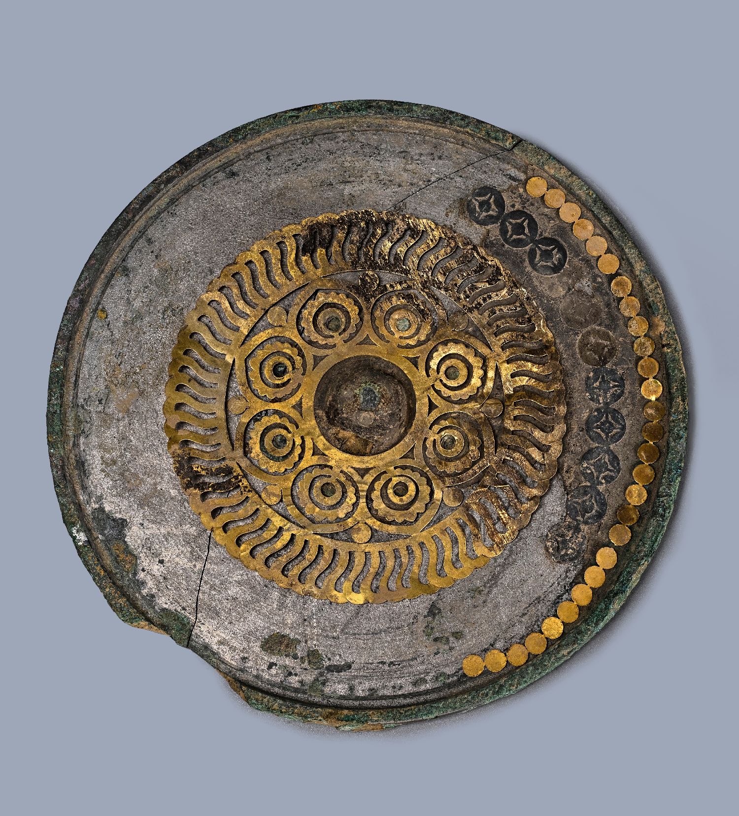 图为出土的金银平脱镜。(图片来源:中新社资料图/陕西省考古研究院供图)