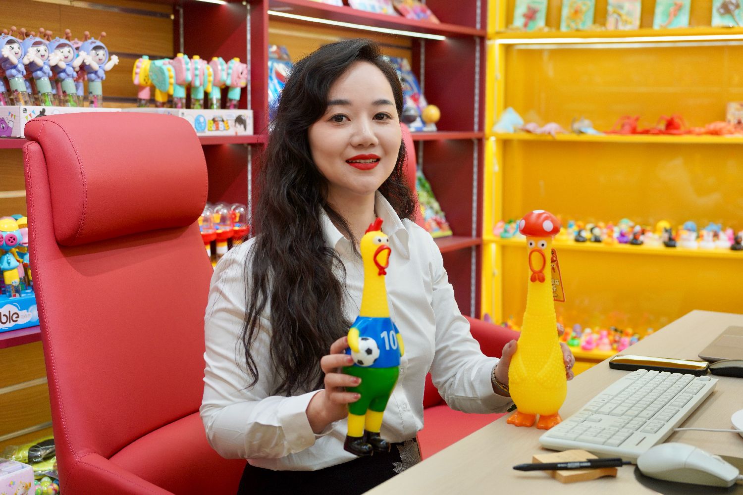 10月14日,义乌港澳总商会监事、玩具行业从业者周玲玲展示店内热销产品。(图片来源:中新社)