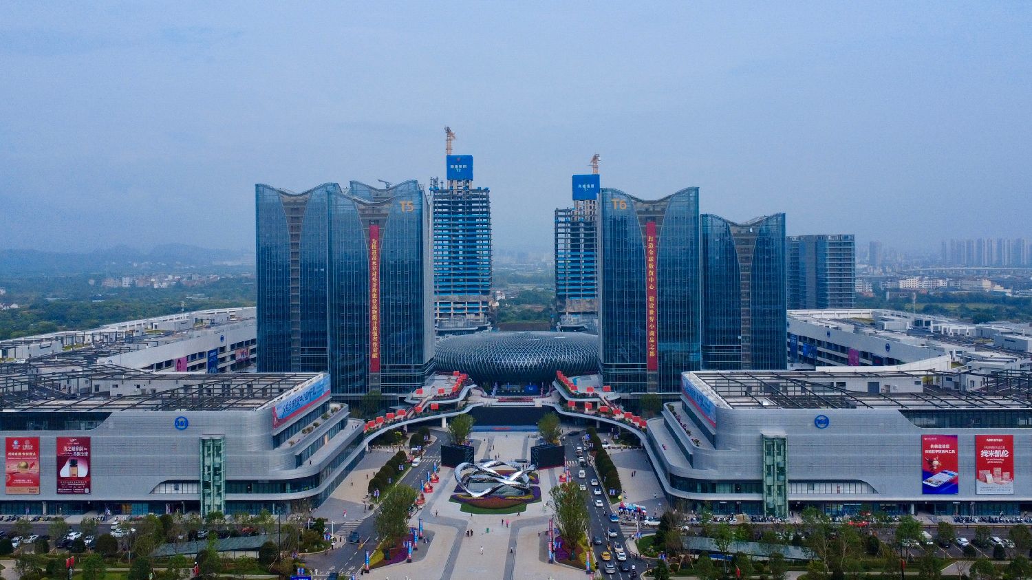 10月14日,航拍全球数贸中心一景。(无人机照片)(图片来源:中新社)