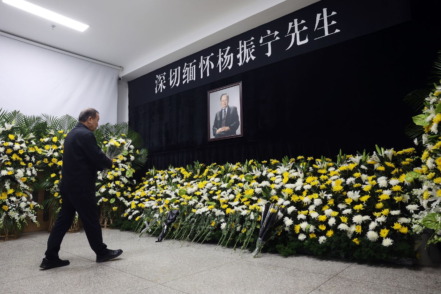 10月18日,一位清华教职工在校内设立的缅怀室吊唁杨振宁先生。(图片来源:中新社)