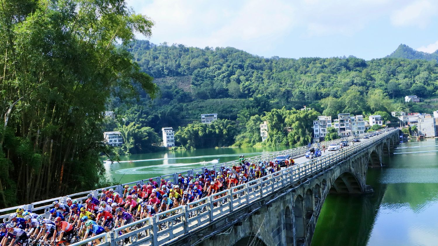 10月17日,2025环广西公路自行车世界巡回赛,车手驰骋在山水间。(图片来源:中新社)