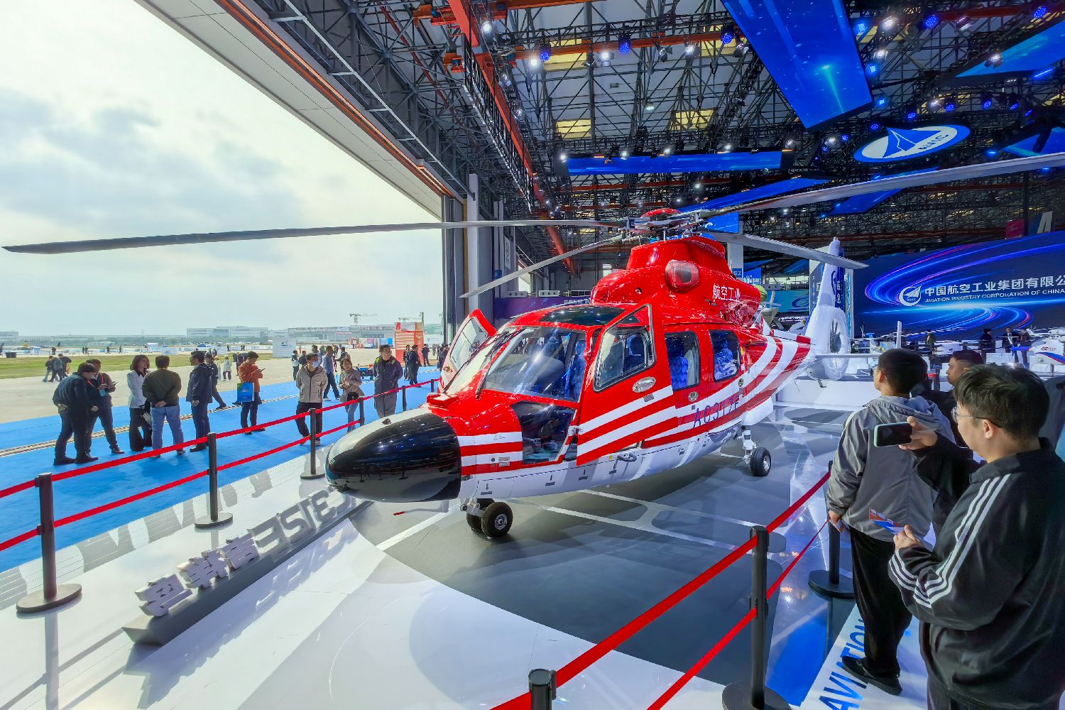 10月16日,第七届中国天津国际直升机博览会开幕,观众在中国航空工业集团展台参观AC312E“吉祥鸟”直升机。(图片来源:中新社)