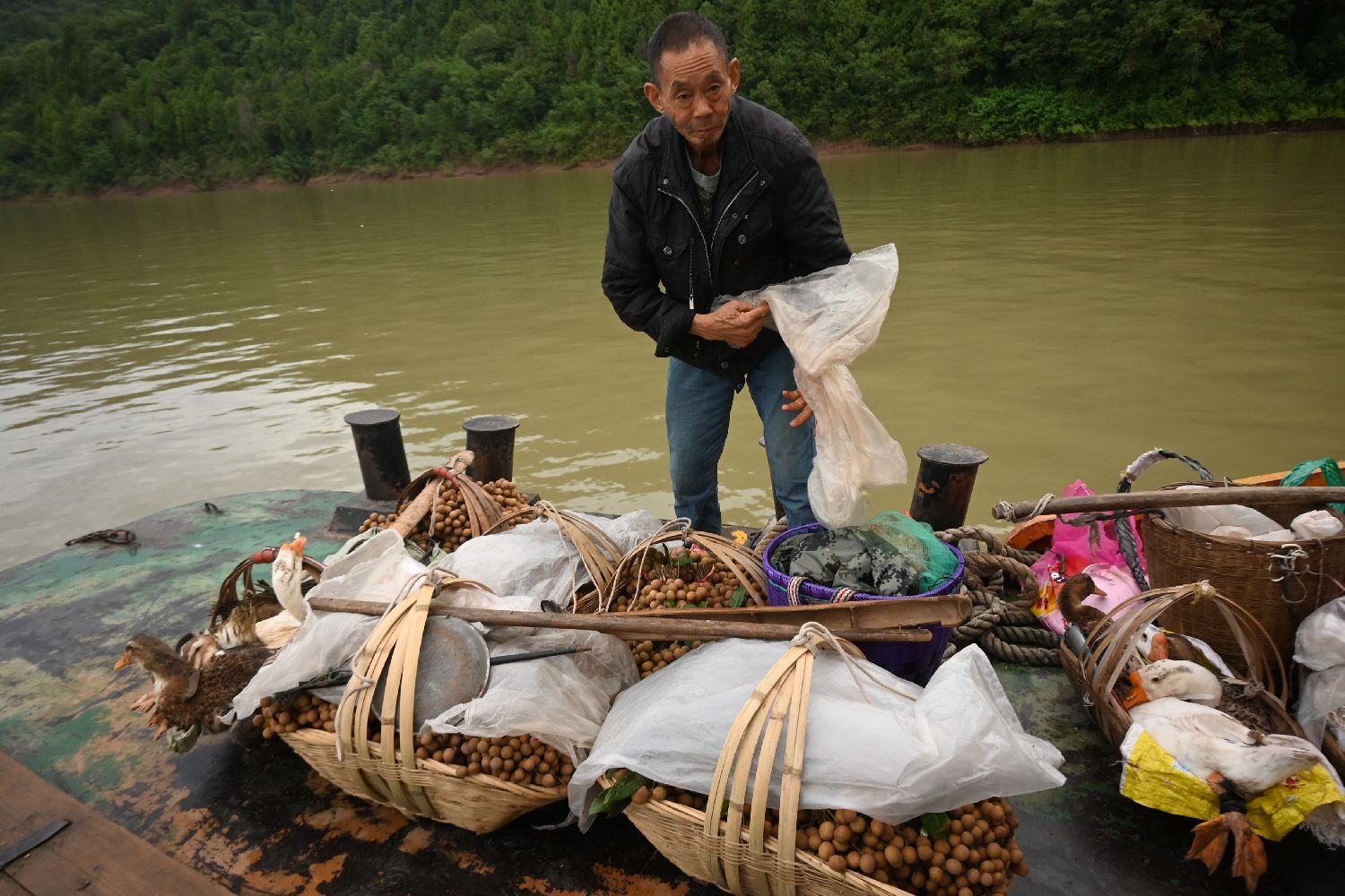 68岁的洋渡镇人李大洪用背篓和竹篮装满了桂圆,准备到忠县县城售卖。“从镇上到县城,也有班车,但我还是爱坐轮渡。”李大洪说,轮渡票价实惠,可携带的货物数量多、种类多。此外,沿途有很多好心人帮忙销售,运气好的话,还没抵达目的地,他的货物就已卖完。