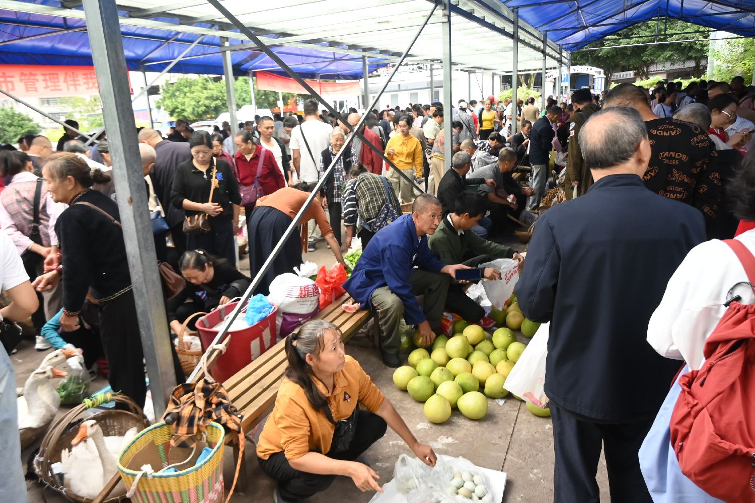 10月17日,重庆忠县西山渡口附近的“菜农临时直销区”内,人员密集。(图片来源:中新社)