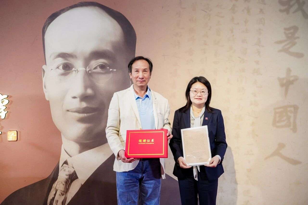 图为戈公振侄外孙孙戈(左)向中国近现代新闻出版博物馆捐赠有关戈公振的信件。(图片来源:中新社/中国近现代新闻出版博物馆供图)