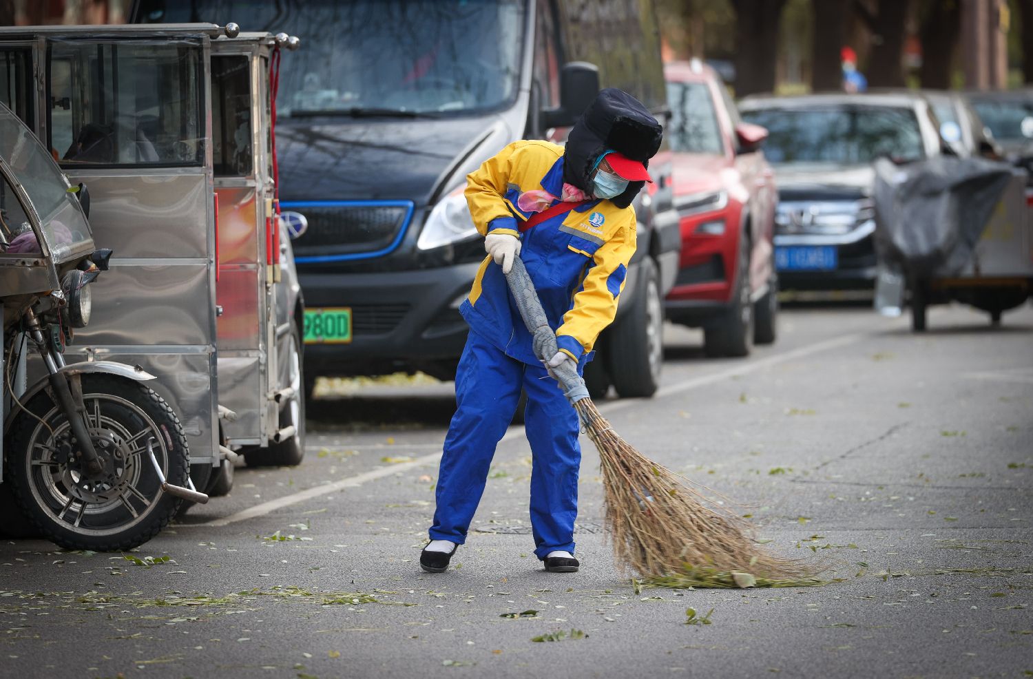 北京一个小区内的物业保洁人员正在清扫落叶。(图片来源:中新社资料图)