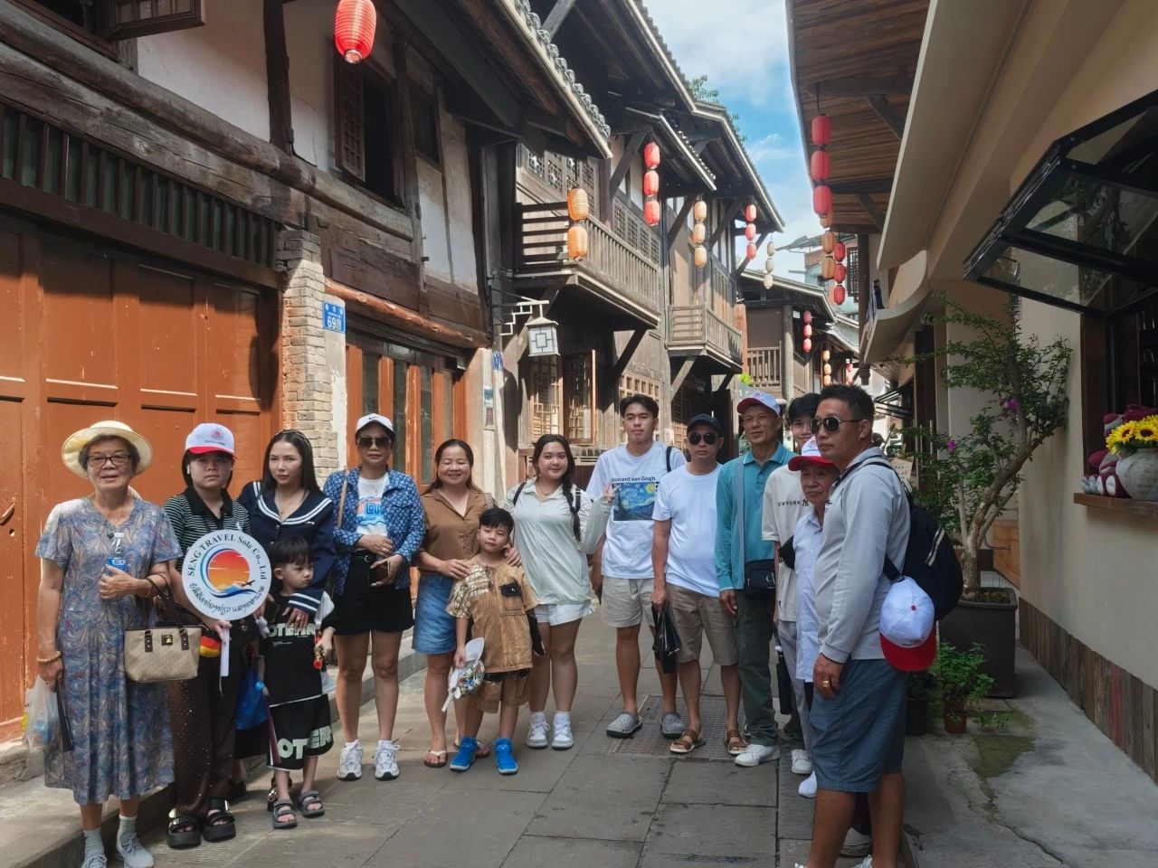 8月25日,老挝游客在重庆市北碚区金刀峡镇偏岩古镇合影。(图片来源:中新社/重庆市北碚区金刀峡镇供图)