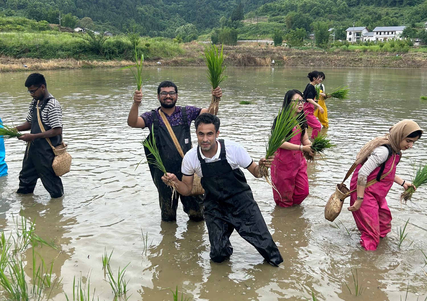 5月31日,国际友人在重庆市北碚区金刀峡镇体验插秧活动。(图片来源:中新社/重庆市北碚区金刀峡镇供图)