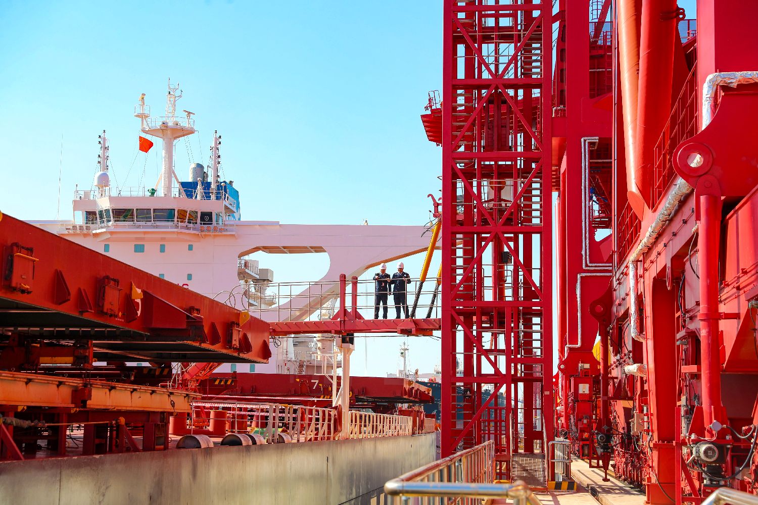 10月27日,山东港口青岛港第二座40万吨矿石码头投产。图为海事执法人员检查码头靠泊轮船的情况。(图片来源:中新社)