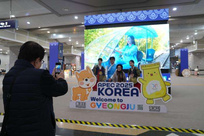 当地时间10月27日,人们在庆州火车站内APEC主题打卡点拍照留念。(图片来源:中新社)