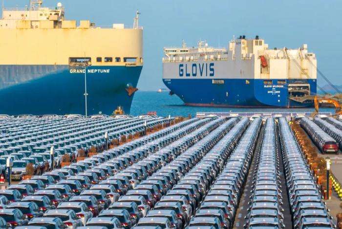 2023年3月17日拍摄的烟台港外贸商品车“出海”场景。(无人机照片)(图片来源:中新社资料图)