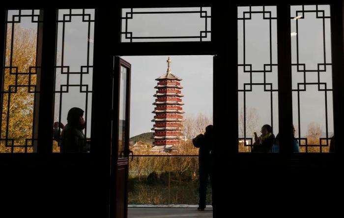 2014年11月11日,APEC领导人非正式会议在北京雁栖湖国际会议中心举行,图为APEC领导人非正式会议新闻中心内远眺雁栖湖秋色迷人。(图片来源:中新社资料图)