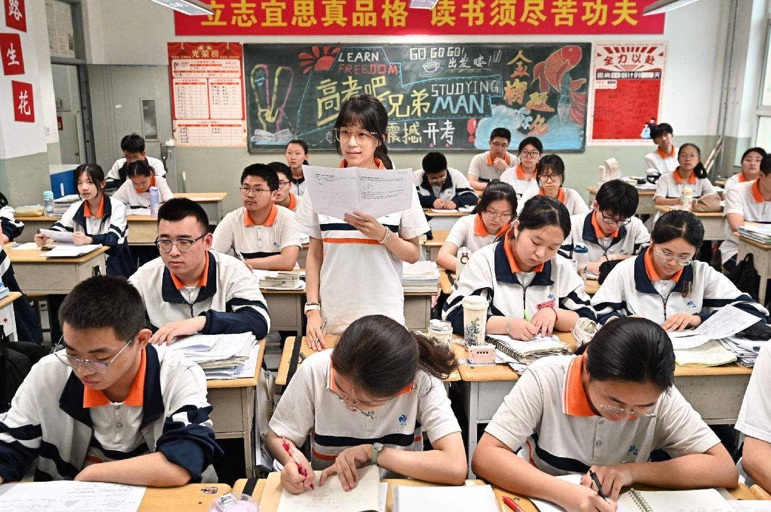 5月22日,山西省太原市第二十四中学校,一名高三学生在课堂上回答老师提问。(图片来源:中新社)