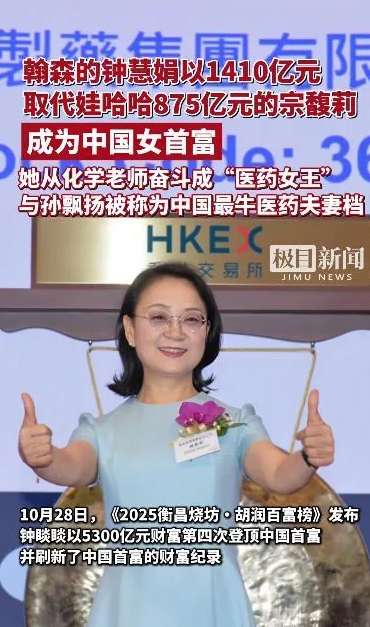 【本报讯】10月30日,胡润研究院发布《2025胡润女企业家榜》显示,中国创新药头部企业翰森的钟慧娟、孙远母女,以1410亿元(人民币,下同)财富首次成为中国女首富。