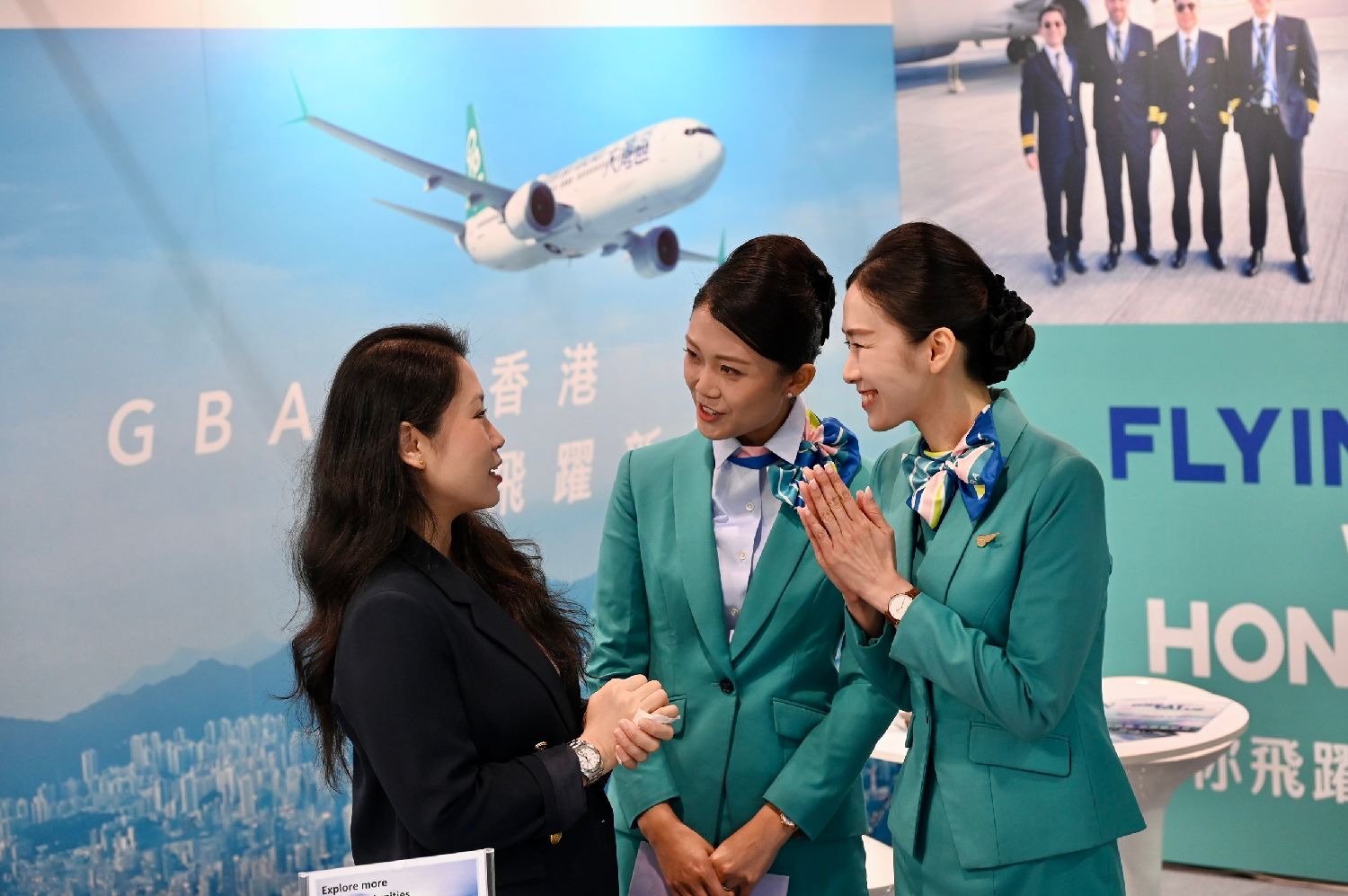2024年5月17日,香港特区政府劳工处与香港国际机场在香港会议展览中心合办“香港国际机场职业博览会2024”。图为现场人士与大湾区航空的空姐交流。(图片来源:中新社资料图)
