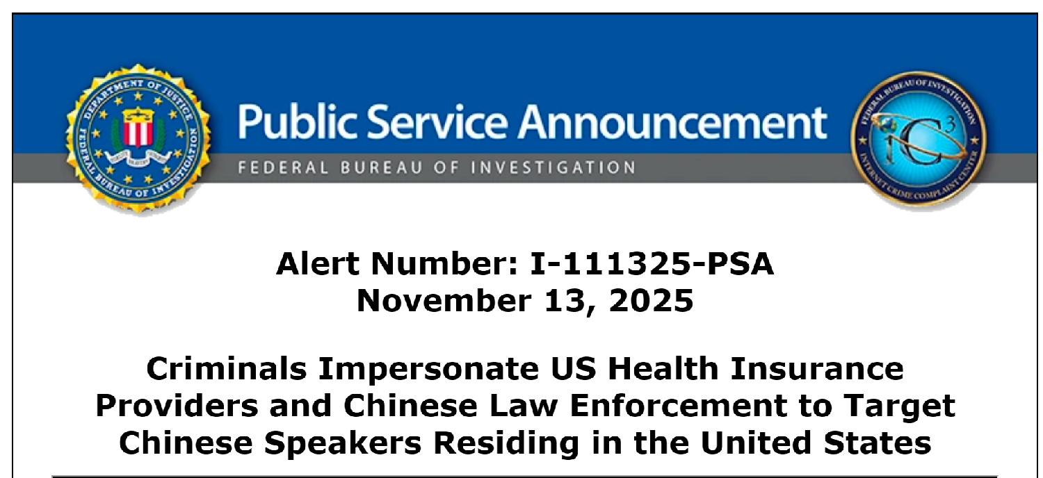 美国联邦调查局(FBI)周四(11月13日)发布公告:一种针对讲中文的在美居住者的新型金融诈骗计划正在上演,嫌犯经常冒充美国医疗保险机构的员工或中国执法人员,对在美华人实施诈骗。