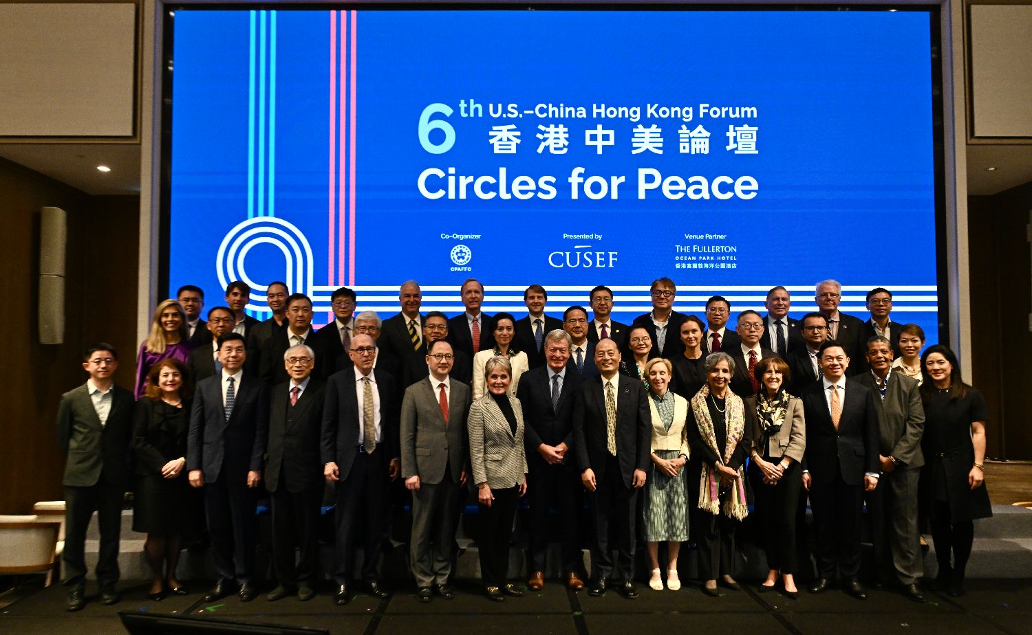 11月17日,中美交流基金会和中国人民对外友好协会在香港举办2025年香港中美论坛。论坛以“共筑和平之环”为主题,中美各界代表350余人参加。图为嘉宾在2025年香港中美论坛上合影。(图片来源:中新社)