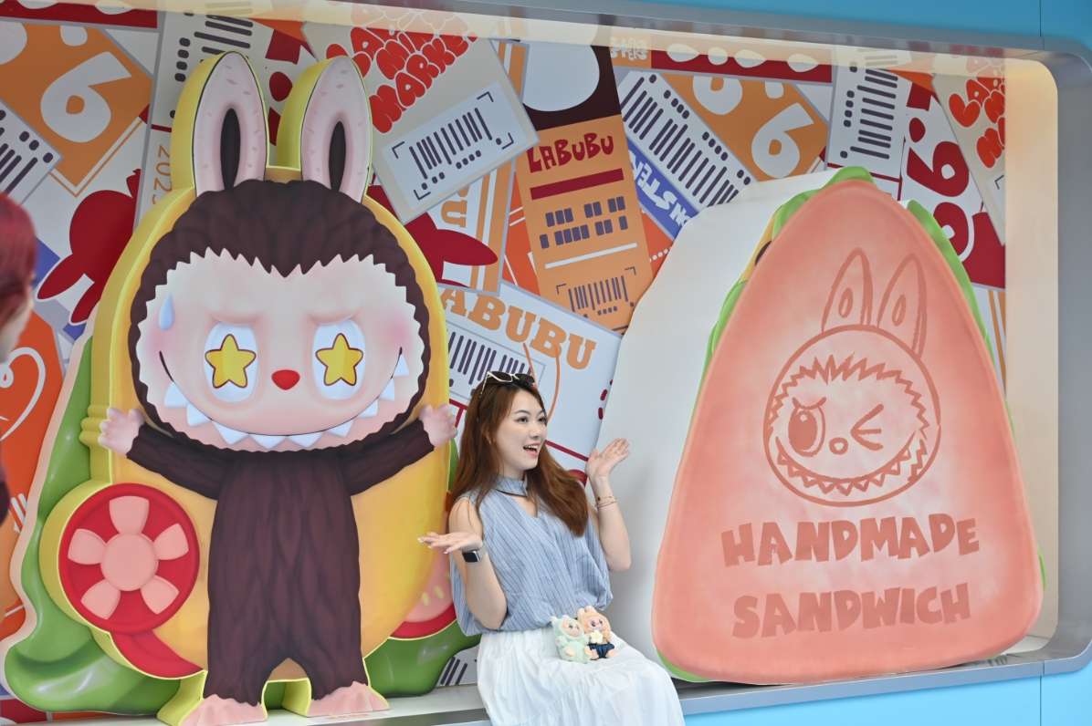 泡泡玛特Labubu怪味便利店在广州市天河区开展,吸引粉丝拍照“打卡”。(图片来源:中新社资料图)
