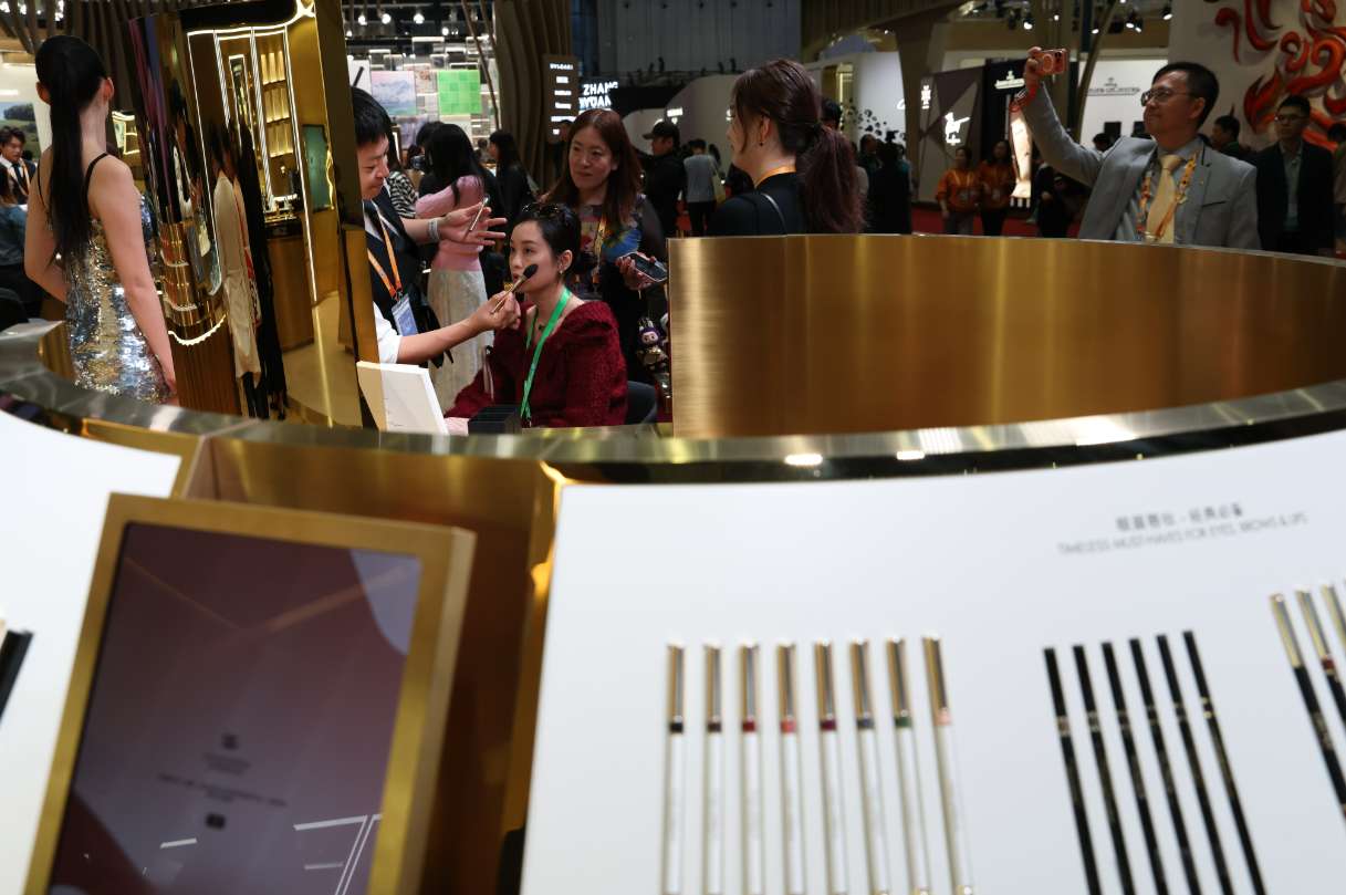 11月7日,参观者在进博会消费品展区试用化妆品。(图片来源:中新社)