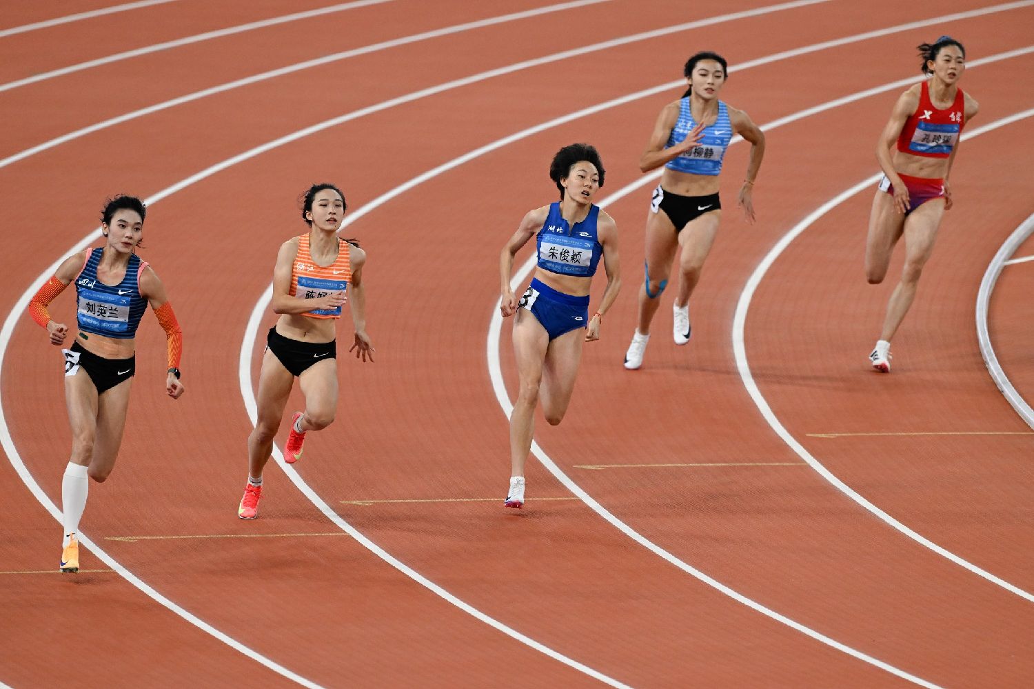 11月19日晚,广东奥林匹克体育中心,浙江队选手陈妤颉(左二)正在参加十五运会田径项目女子200米决赛。(图片来源:中新社)