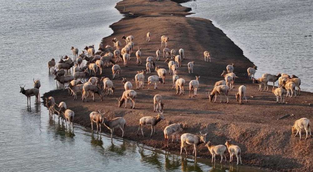 十九世纪末二十世纪初,麋鹿被外国人运到欧洲动物园,中国本土麋鹿灭绝。1985年,中国与英国签订麋鹿重引进协议,22头麋鹿重归故里。后来石首麋鹿保护区成立,从北京引进64头麋鹿。如今,保护区历经几十年的培育,已从最初引进的64头麋鹿,发展至4500余头,其中野外扩散种群达1600余头,形成全球最具规模与活力的野生麋鹿种群。