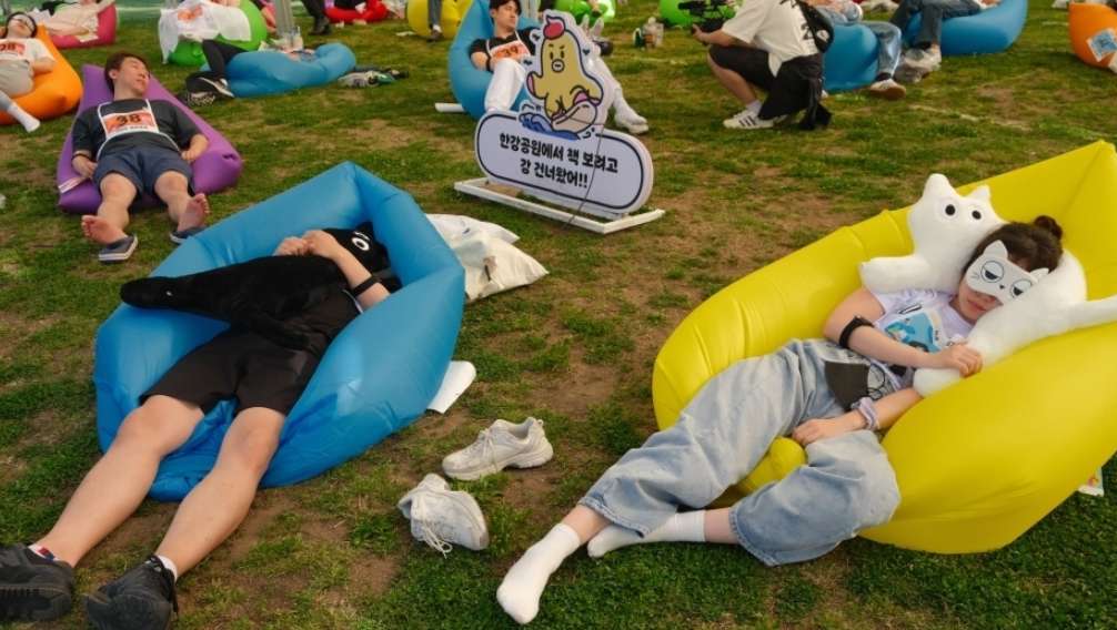 韩国首尔市政府在汝矣岛汉江公园举行“汉江睡觉大赛”。图为参赛者在比赛中。(图片来源:中新社资料图)