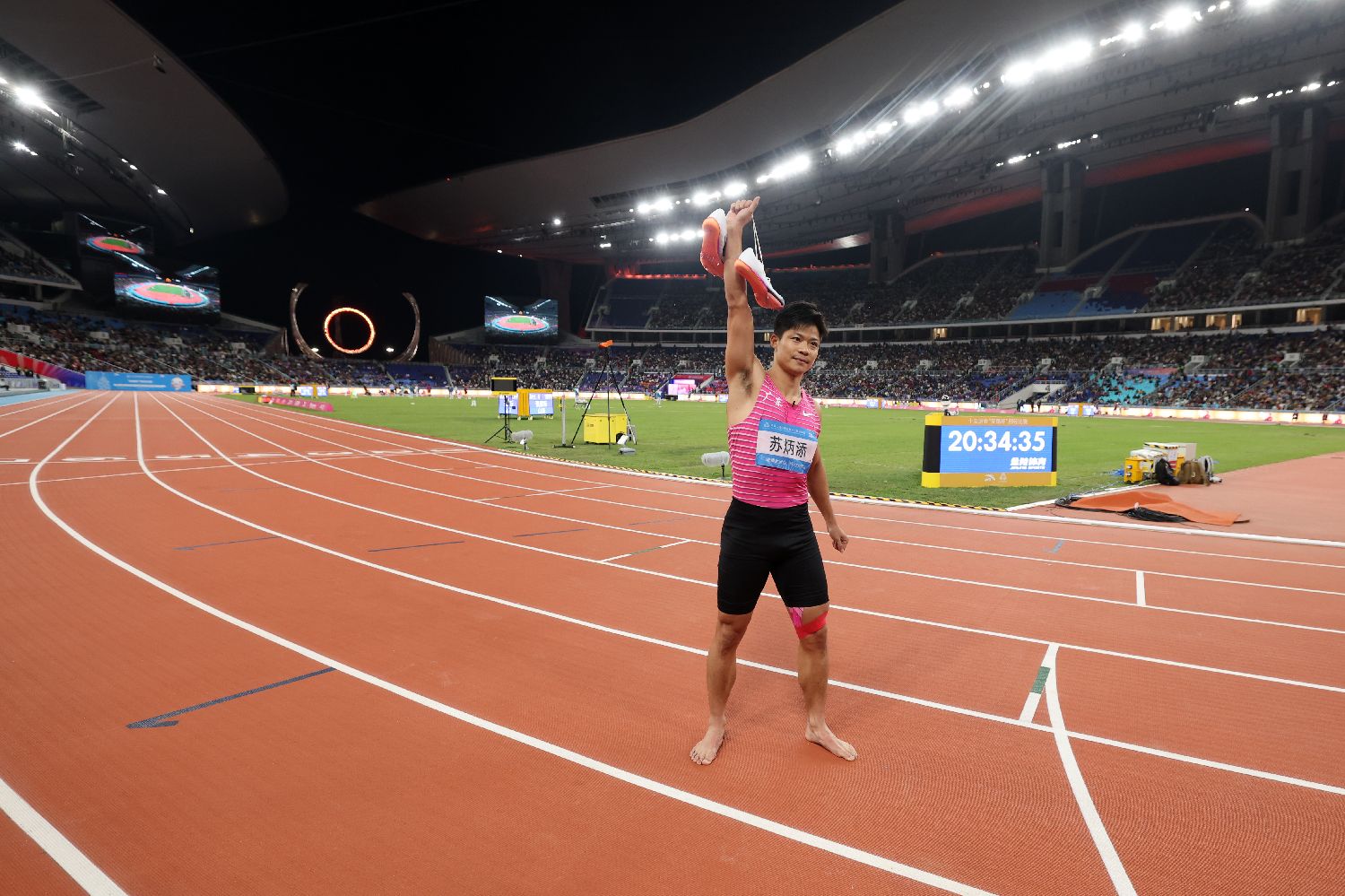 2025年11月20日,中国第十五届全国运动会田径男子4x100米接力决赛在广东省奥体中心体育场举行。由苏炳添领衔的广东队夺得第四名。这也成为“亚洲飞人”苏炳添的谢幕之战。赛后他绕场一周向观众致意。(图片来源:中新社)