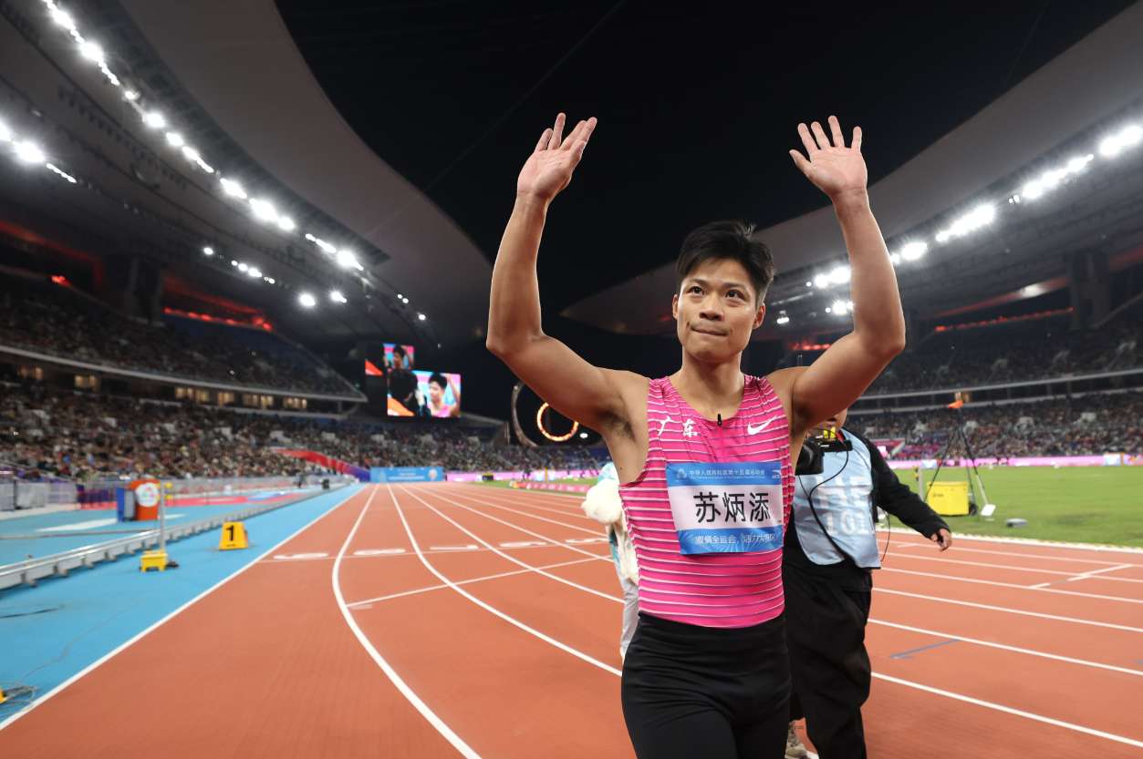 11月20日,第十五届中国全国运动会田径男子4x100米接力决赛在广东省奥体中心体育场举行。由苏炳添领衔的广东队以38秒71夺得第四名。这也成为“亚洲飞人”苏炳添的谢幕之战。赛后他绕场一周向观众致意,并宣布退役。(图片来源:中新社)