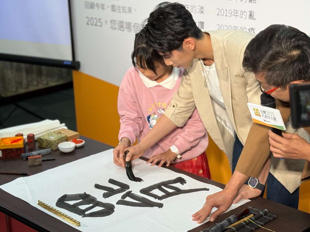 12月10日,“台湾2025代表字大选”在台北公布结果,“罢”在60个候选字中以最高票当选。图为与会嘉宾台湾拳击选手林郁婷(中)和台中小学生蔡婷而(左一)共同书写“罢”字。(图片来源:中新社)