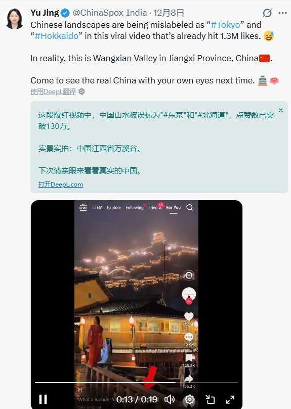武汉“极目新闻”客户端报道,12月8日,中国驻印度大使馆发言人宇静在社交平台X上发帖辟谣称:“这段已经获得130万点赞的热门视频里,中国的风景被错误标注为东京和北海道。实际上,这是中国江西望仙谷。请你们亲自来中国,看看真正的中国吧。”