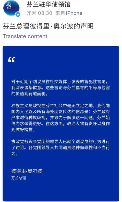 芬兰总理的中文道歉文案。(图片来源:芬兰驻华使领馆官方微博)