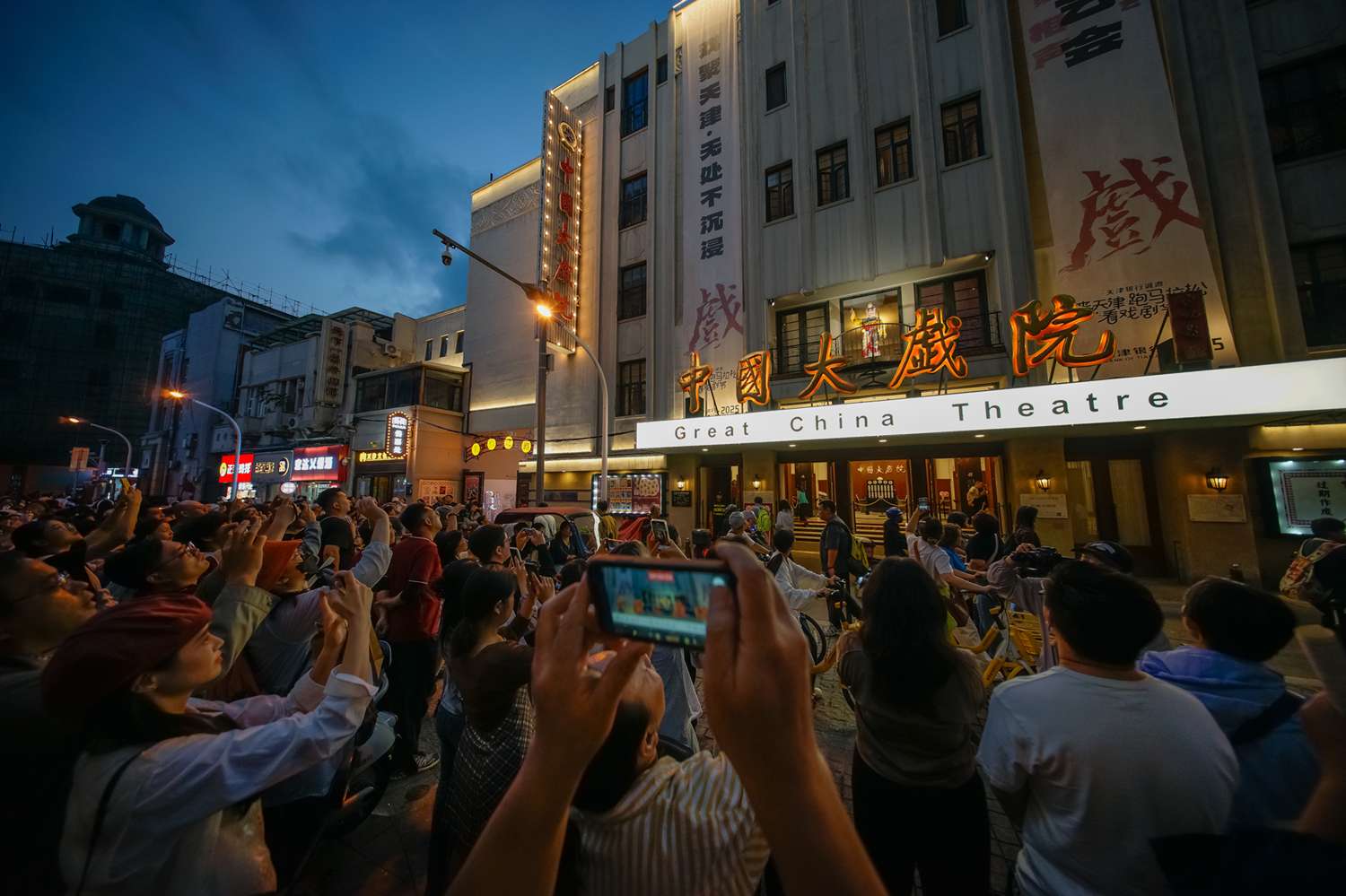 10月3日,民众在位于天津和平区的中国大戏院观看阳台京剧快闪《霸王别姬》。(图片来源:中新社)
