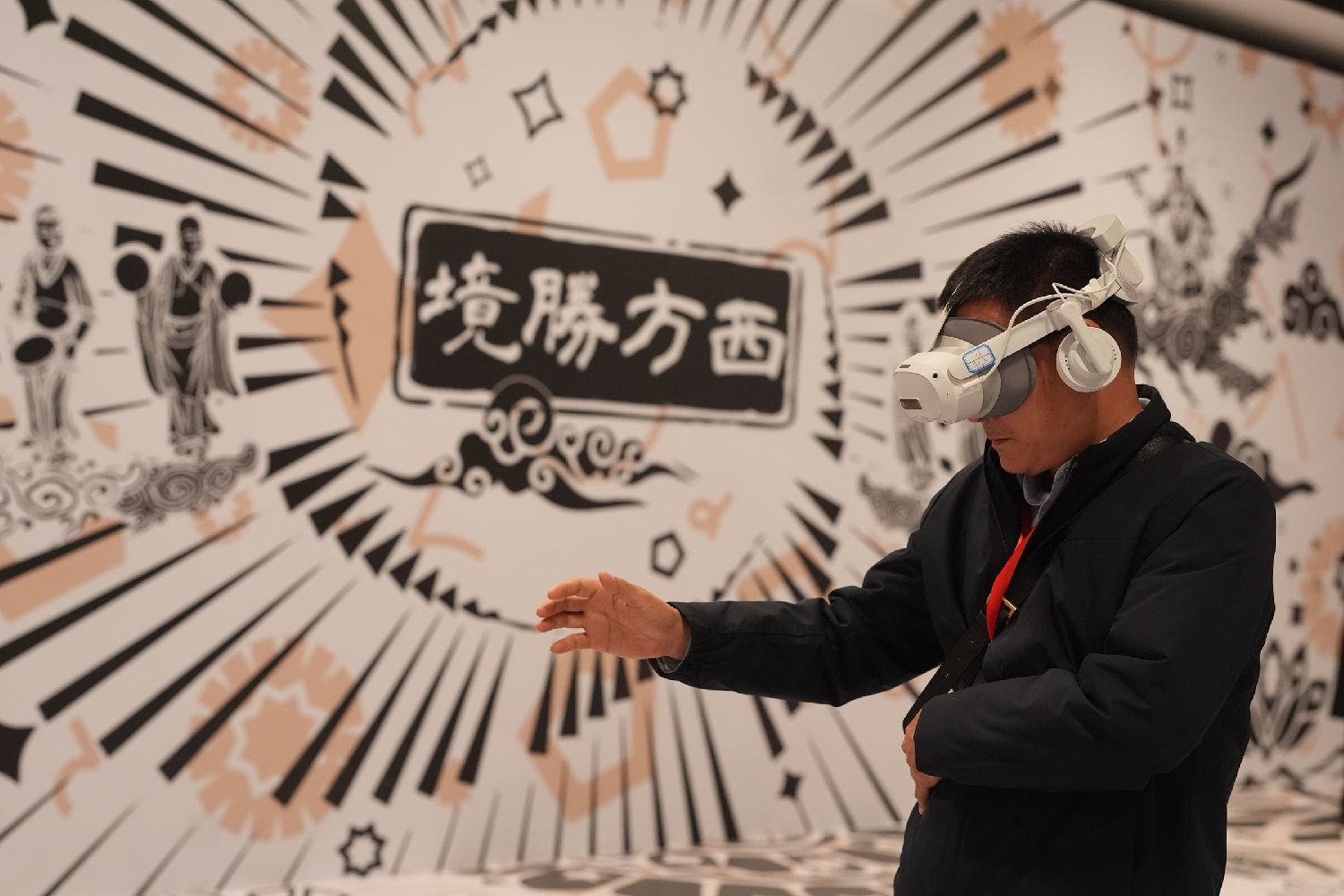 12月22日,“既往未来——小西天文物撷珍与悬塑艺术特展”在中国国家典籍博物馆开幕。图为观众戴上VR眼镜进行体验。(图片来源:中新社)
